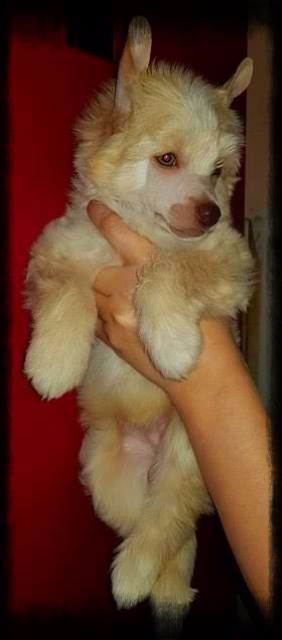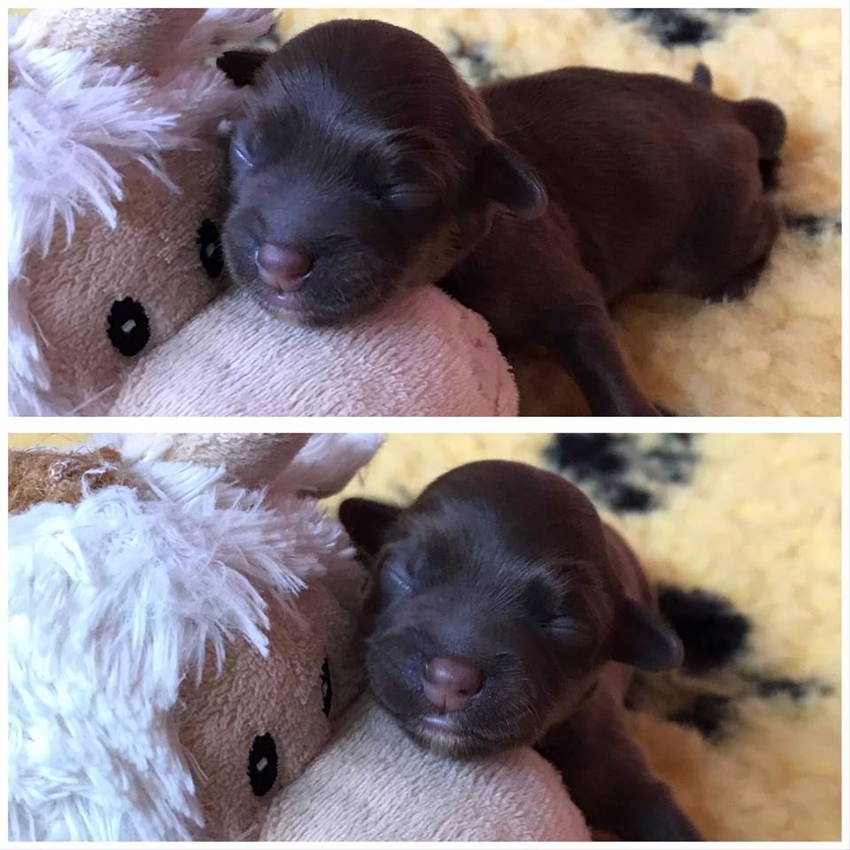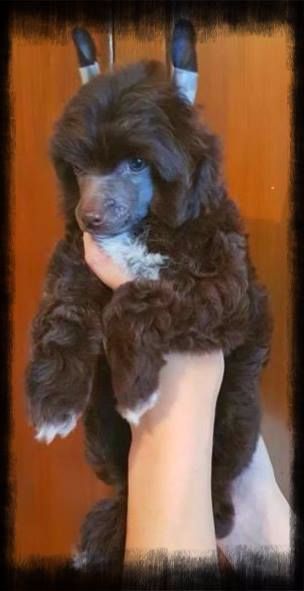 Mâle houppette chocolat, au pelage exceptionnel, qui ressemble beaucoup à sa maman Jaïa de L'Antre de Hôkô; chien très joueur et particulièrement sociable.